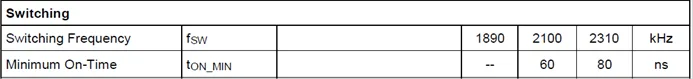由于 VS 是固定的,所以是 D1 决定了输出电压,而 D1 是占空比。一般的 Buck器件规格书通常都会给出最大占空比的值,我们根据规格书中的数据和实际的最低输入电压,便知道能够得到的最高输出电压是多少,或者说是反过来,根据最低输入电压、输出电压和最高占空比,我们便知道这款器件是否能够满足我们的要求,这在输入、输出压差很低的场合是很重要的一个考虑因素。 器件规格书通常不会给出最低占空比是多少,但会给出一个最短导通时间的参数,同时会给出一个工作频率的数据,工作频率的倒数即是工作周期 TS,最短导通时间即是上述公式中的 t1 的最小值,它对应着占空比 D1 的最小值。以 RTQ2130B为例,这是一款工作电压范围为 3V-36V、负载能力 0.7A、工作频率为2.1MHz±10% 的 Buck 器件,通过了 AEC-Q100 Grade 1 认证,这意味着它可以在非常恶劣的环境条件下(-40℃~125℃)长期可靠地工作,它的规格书是这样来表示这些参数的: